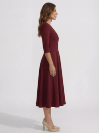 The Chiara tiene un escote en V profundo que alarga el cuello, un corpiño estructurado que define la cintura, y una falda midi con vuelo que se mueve contigo. Mangas 3/4 que estilizan los brazos. Costuras de sastrería que marcan la silueta sin apretar.